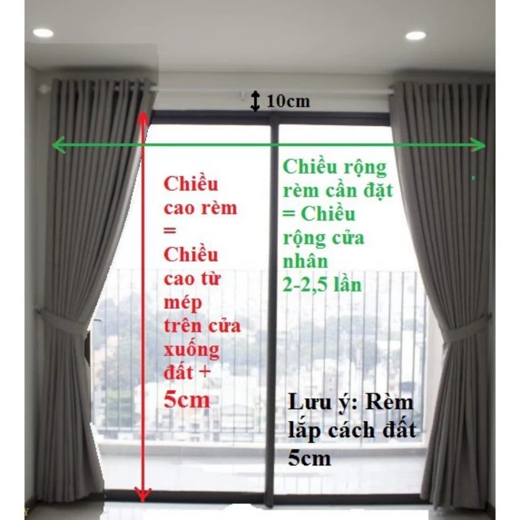 (ví dụ, chiều ngang cửa nhà bạn rộng 2m bạn tính thêm độ phủ cho cửa sẽ là 2.5m để tạo nhún cho rèm thì lấy gấp đôi kích thước phủ cửa là 5m rèm. bạn nên mua 2 tấm rèm mỗi tấm ngang 2.5m ) còn chiều cao rèm bạn đo và quan sát xem phía chân rèm có vướng vào các vật dụng như giường , tủ, bàn trang điểm…đưa ra kích thước cuối cùng để shop cắt ngắn chiều cao rèm cho phù hợp nha !